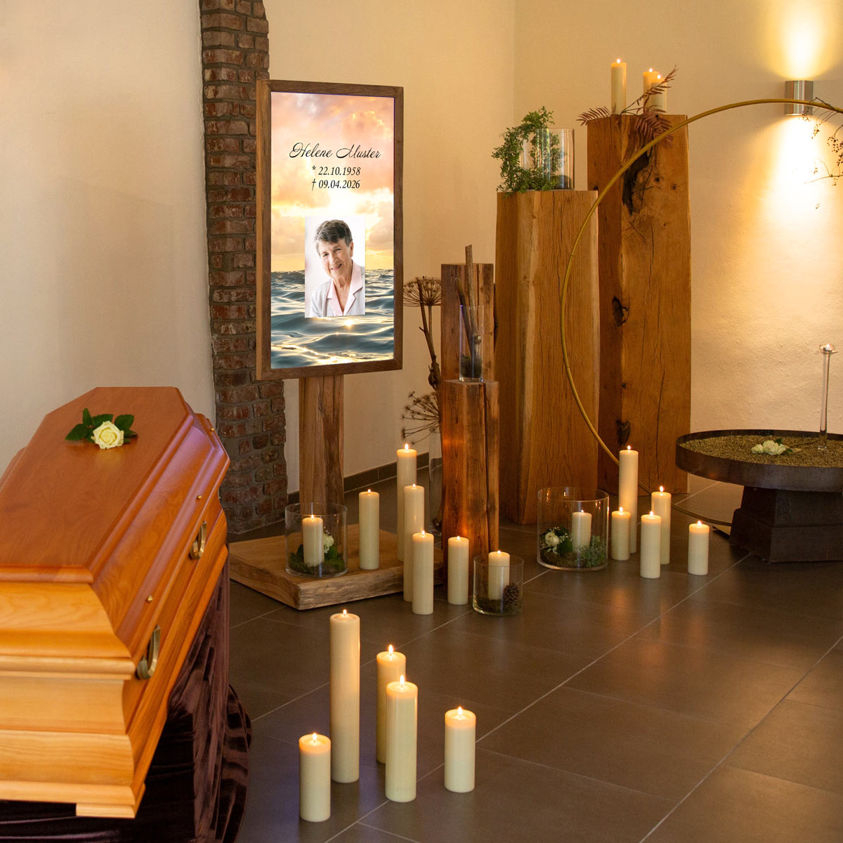 Rollbare Bestatter Displays für eigene Trauerhallen, Kirchen und Friedhofskapellen